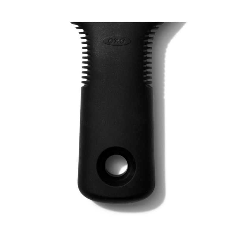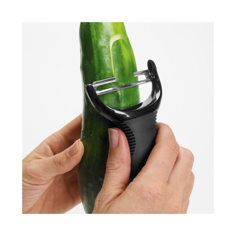 L'éplucheur rasoir en forme de Y comporte une lame lisse et tranchante des 2 côtés afin de pouvoir travailler dans un mouvement de va-et-vient. Pivotante, sa lame se veut flexible afin de bien épouser les contours du légume et ainsi éviter tout gaspillage. Cet éplucheur Y est particulièrement pratique pour des légumes longs (carottes, courgettes..) et des légumes ronds qui demandent un appui pour les peler (potimarrons, navets...). Cet éplucheur est fourni avec un capuchon de sécurité transparent et rabattable pour protéger la lame et ne pas risquer de se couper. L'un des côté de l'éplucheur est muni d'un ergot pour retirer les imperfections ou les parties abîmées du fruit. Enfin, son manche en Santoprène est caractéristique des meilleurs produits OXO, il est antidérapant donc pratique pour travailler avec les mains humides et très ergonomique pour un confort maximal même avec des gestes très répétitifs. Les petits coussins sur les côtés du manche absorbent la pression pendant l'utilisation, très utile quand on a des problèmes de préhension.
