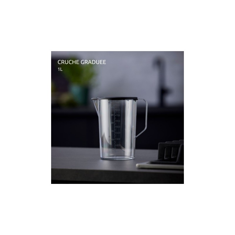 - Une cruche de 1L graduée avec couvercle et poignée, pour les préparations liquides qui doivent ensuite être transvasées (smoothie, compote...) ou des sauces, chantilly, blancs en neige qui nécessitent l'utilisation des disques fouet ou mélangeur.