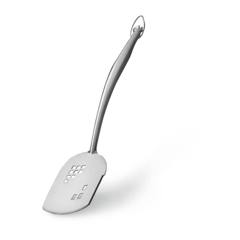 Fabriquée en acier inoxydable de haute qualité, cette spatule offre une robustesse et une durabilité exceptionnelles. Sa longueur de 45 cm permet de manipuler facilement les aliments sans se brûler, tandis que la poignée ergonomique assure une prise en main confortable.
