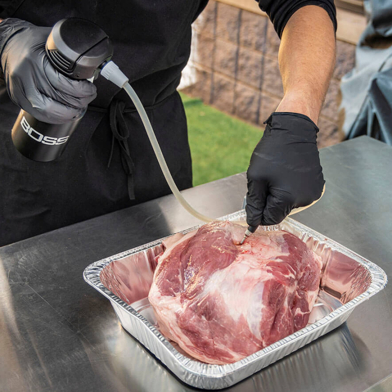 Pour améliorer la saveur et la texture de la viande, utilisez cet outil pour vaporiser et injecter la protéine avec le liquide de votre choix.