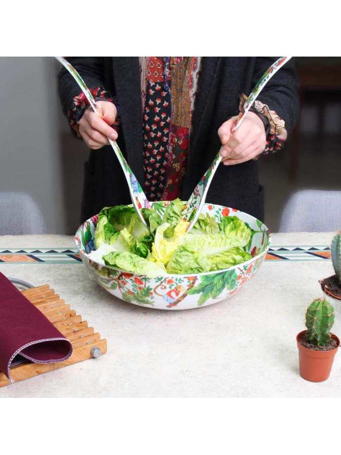 Optez pour une vaisselle originale pour colorer vos tables ! Le grand saladier Singes de Bali des Jardins de la Comtesse décoré à l'intérieur et à l'extérieur mettra votre tablée en valeur.